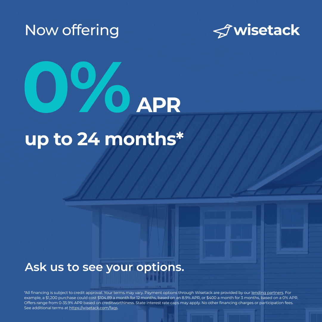 *All financing is subject to credit approval. Your terms may vary. Payment options through Wisetack are provided by our lending partners. For example, a $1,200 purchase could cost $104.89 a month for 12 months, based on an 8.9% APR, or $400 a month for 3 months, based on a 0% APR. Offers range from 0-35.9% APR based on creditworthiness. State interest rate caps may apply. No other financing charges or participation fees. See additional terms at https://wisetack.com/faqs.